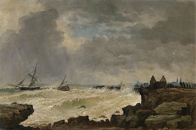dramatic maritime painting depicting ships struggling in stormy seas. The artwork shows rough, white-capped waves under a dark, cloudy sky. On the right side, there is a rocky cliff or shoreline with some small structures or figures visible on top. In the turbulent water, you can see what look like sailing vessels being tossed by the waves. The painting has a moody, atmospheric quality with muted colors predominantly in grays, browns, and whites, capturing the power and danger of a storm at sea.