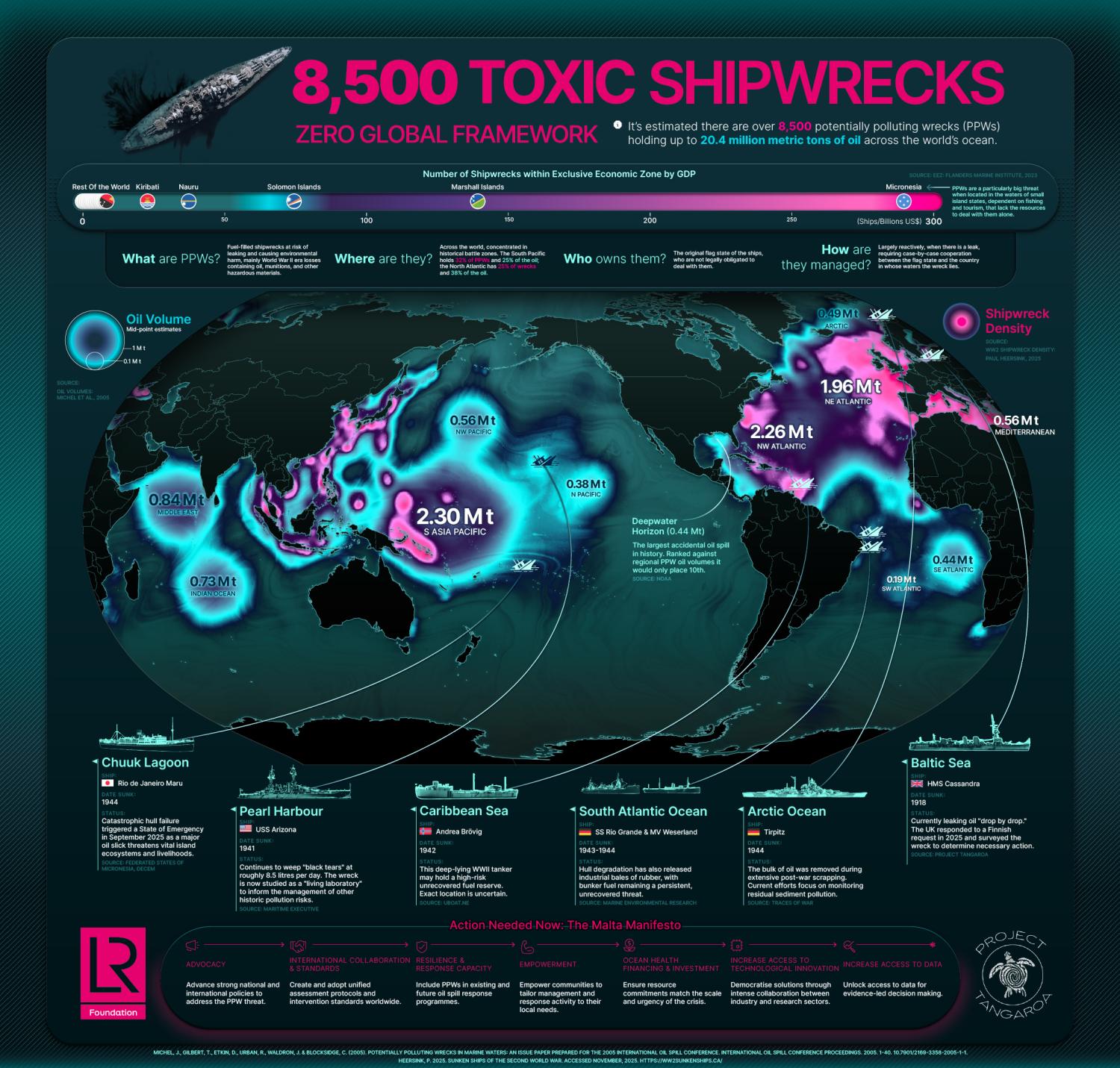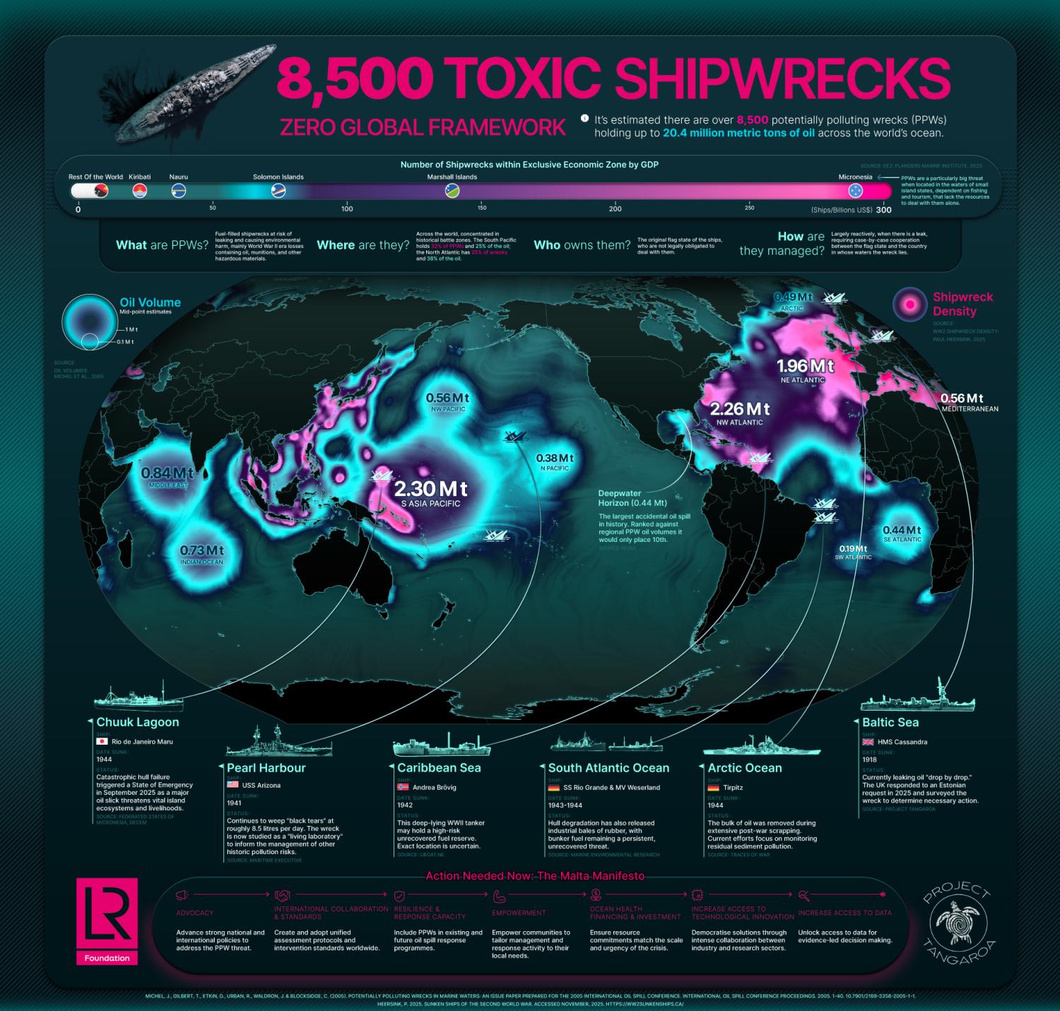 You are welcome to reuse this graphic for non-commercial purposes, with attribution. Example citation: Lloyd’s Register Foundation & Visual Capitalist. 2025. Mapping the threat of potentially polluting wrecks (available at https://www.lrfoundation.org.uk/publications/potentially-polluting-wrecks-protecting-people-and-planet).